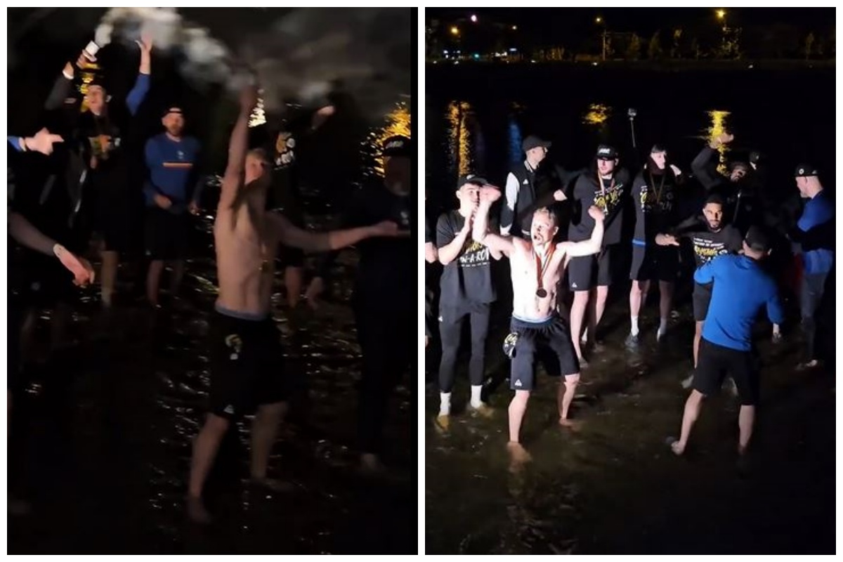 Tradiționala baie în râu a adunat în apă jucători, antrenori și chiar câțiva suporteri curajoși, în vreme ce mulți alții au rămas pe mal, aplaudând și filmând momentul