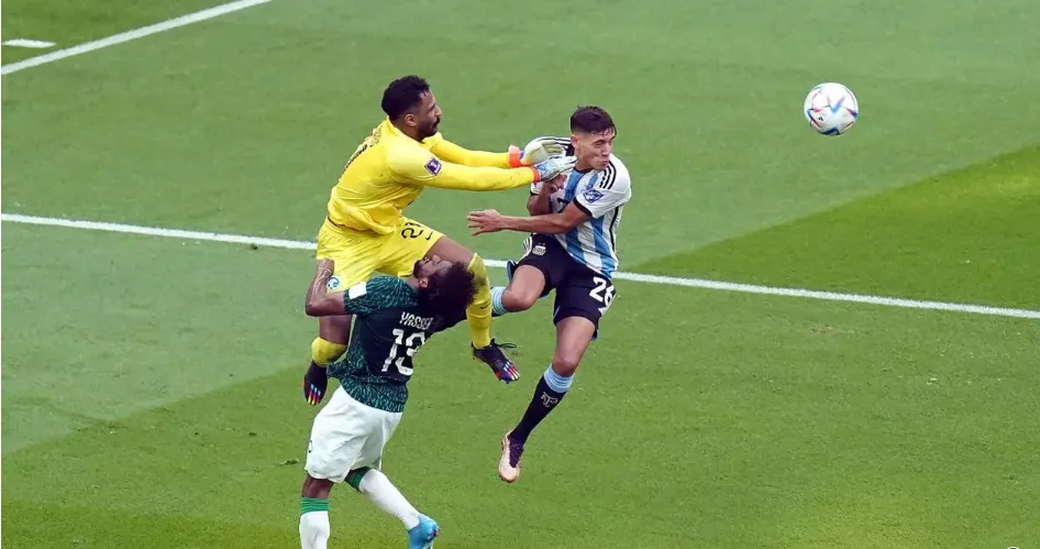 În minutul 90+5 al meciului, când Arabia Saudită încerca să mențină avantajul minim de pe tabelă, 2-1, argentinienii au aruncat mingea în careul advers. Portarul Al Owais a ieșit pentru a respinge balonul și a reușit să îl boxeze departe de poartă, dar în același timp, l-a lovit pe fundașul stânga Yasser Al-Shahrani cu genunchiul în figură.