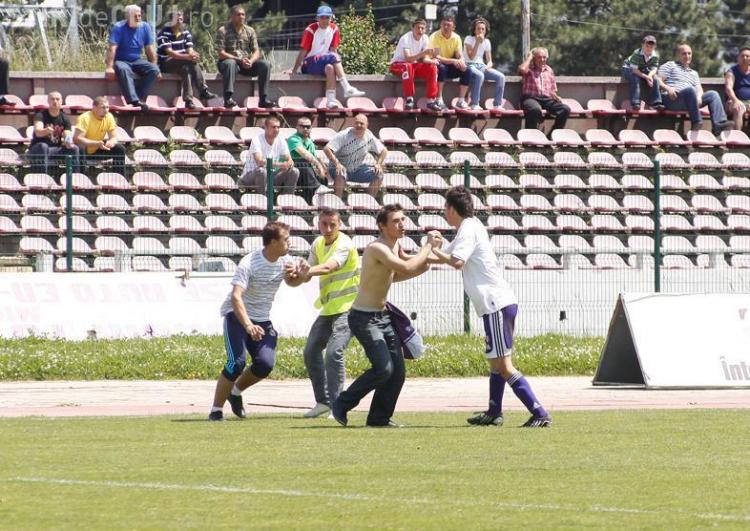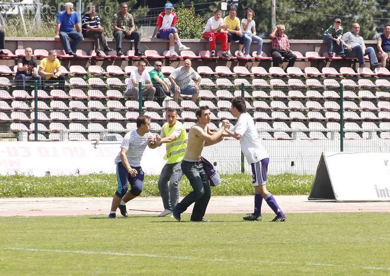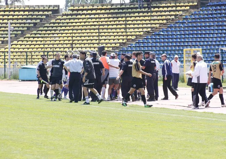 Claudiu Baboia a fluierat finalul partidei si a fugit la vestiare cu ajutorul echipelor de securitate. Jucatorii de la Universitatea Cluj au facut acelasi lucru de frica sa nu fie batuti.