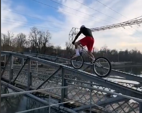 Clipul, filmat pe timp de zi, a surprins doar intrarea biciclistului pe marginea podului, și sperăm că doar până acolo a fost tot.