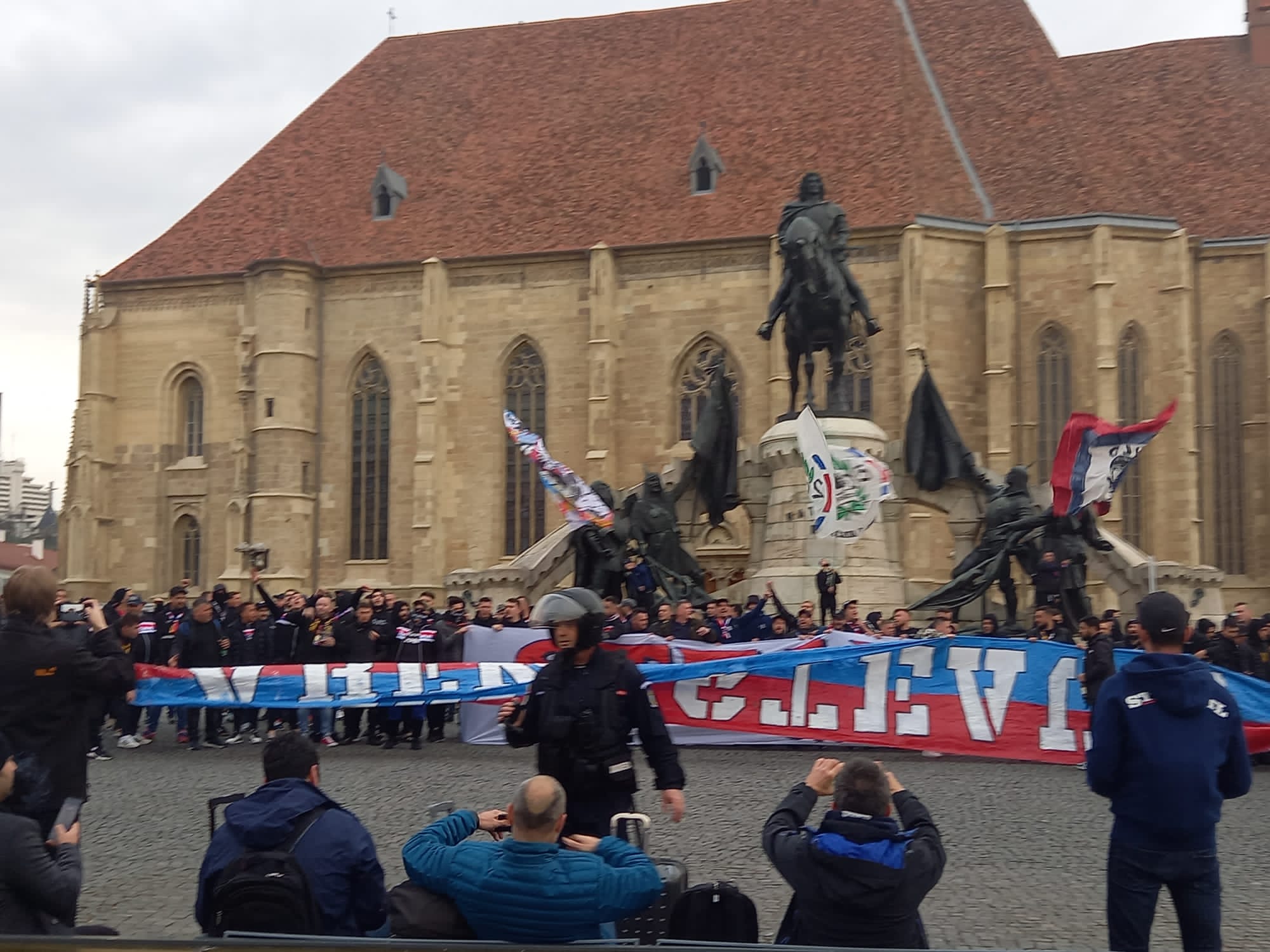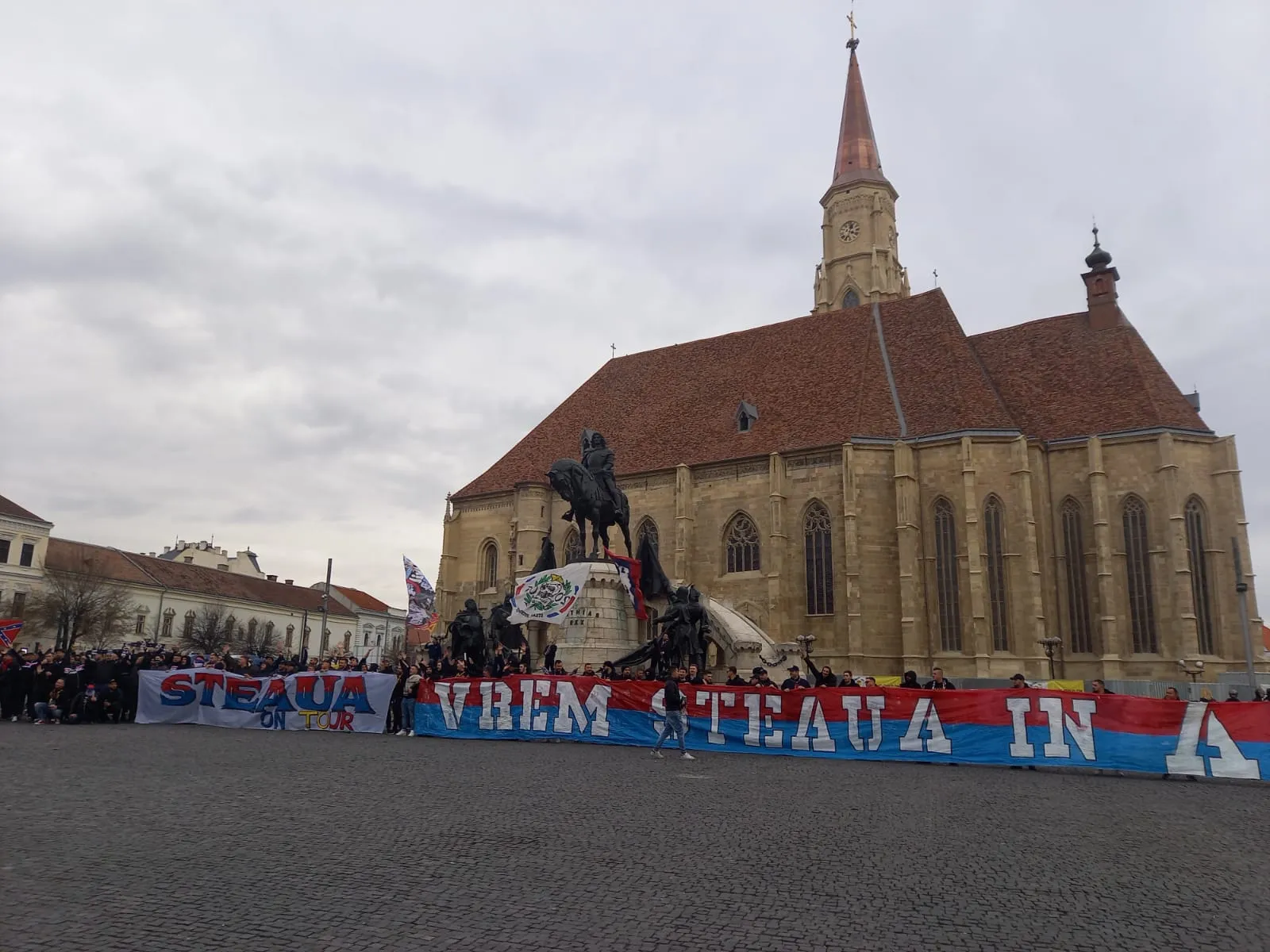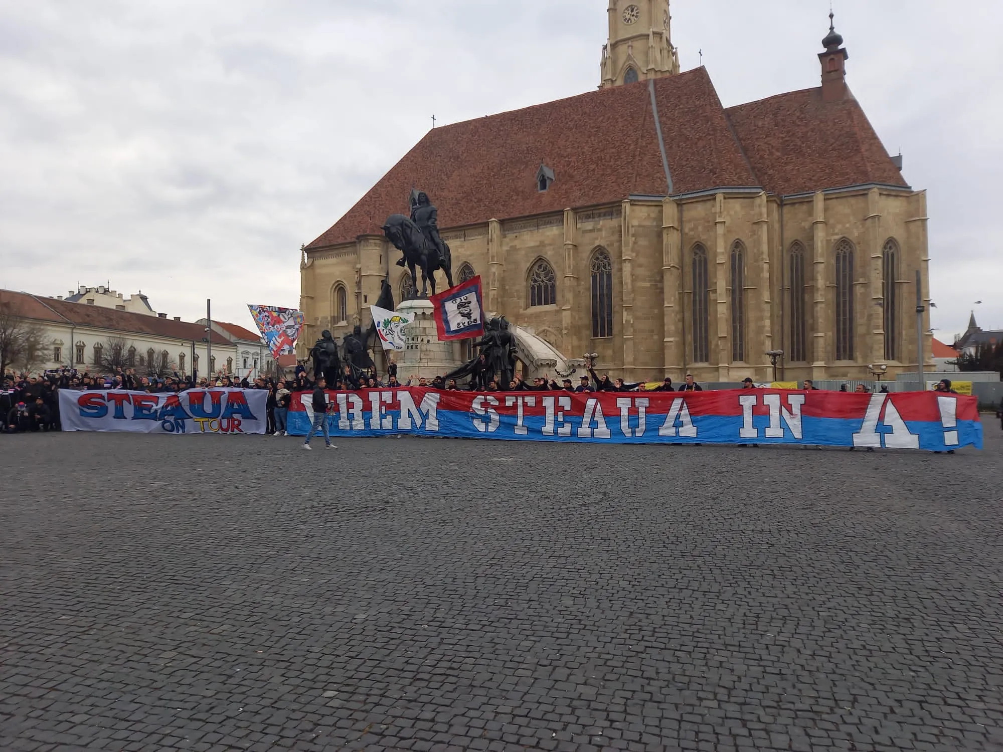 Suporterii CSA Steaua au desfășurat un banner uriaș în Piața Unirii, din Cluj-Napoca, înainte de meciul cu Universitatea Cluj.