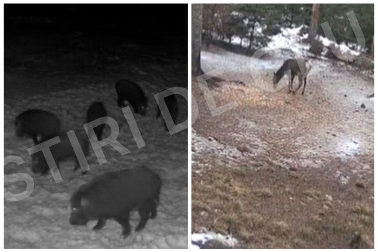 Patru cerbi au fost surprinși într-un cadru de poveste din Parcul Natural Apuseni, bucurându-se de hrana oferită de specialiști.