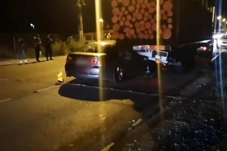 Un autoturism a intrat sub un camion cu lemne la ieșire din Dej.
