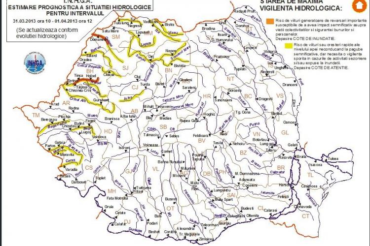 Institutul Naţional de Hidrologie şi Gospodărire a Apelor (INHGA) a emis o avertizare de tip cod galben pentru mai multe județe, printre care și Clujul.