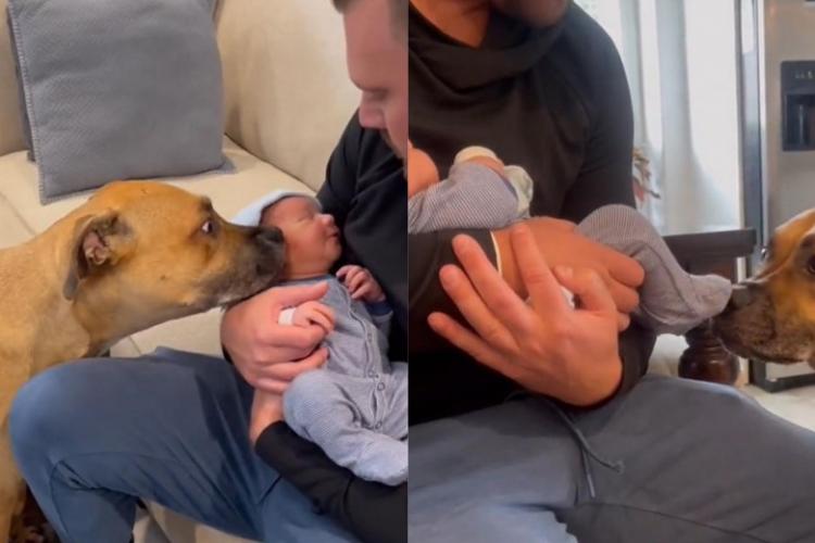 Imaginile cu un câine au devenit virale după ce stăpânii lui au filmat reacția acestuia când au adus acasă bebelușul lor. Buldogul american l-a primit cu căldură pe micuțul membru.