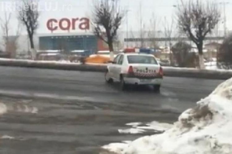 O masina de politie a fost filmata pe Bulevardul 1 Decembrie 1918, in timp ce "taia" linia dubla continua, desi la cativa metri era un sens giratoriu, folosit de ceilalti soferi.