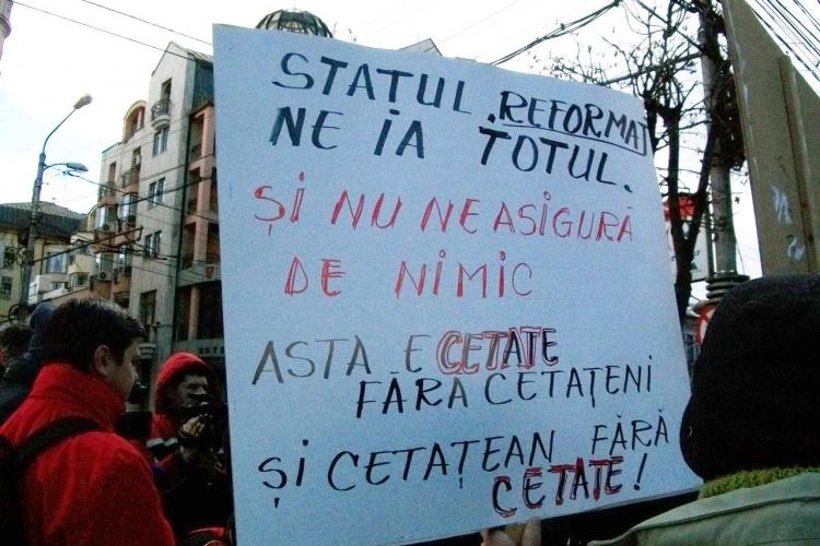 Un protest al sindicatului Cartel Alfa a avut loc joi, 14 noiembrie, în jurul orei 15.00, în faţa Prefecturii Cluj. Sindicaliştii cer eliminarea măsurilor de austeritate şi mai multe locuri de muncă.