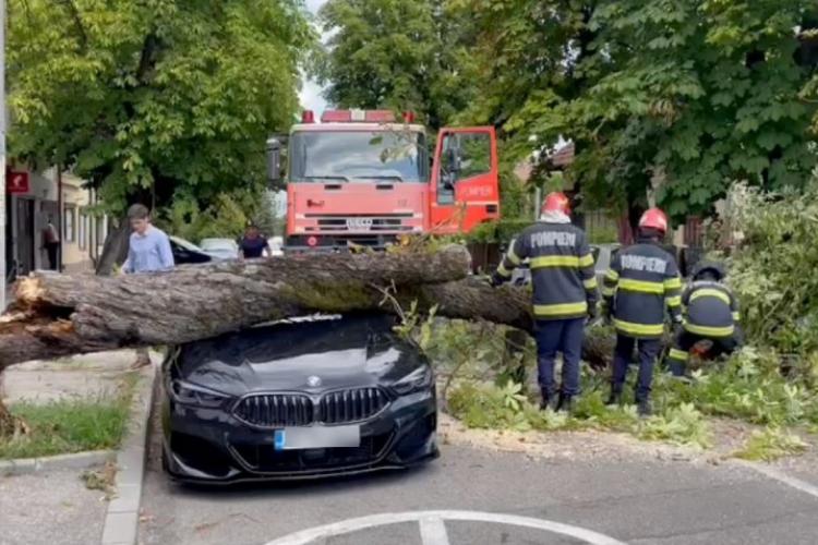 Un BMW de 100.000 de euro a fost puternic avariat, după ce pompierii au scăpat un copac pe mașina de lux.