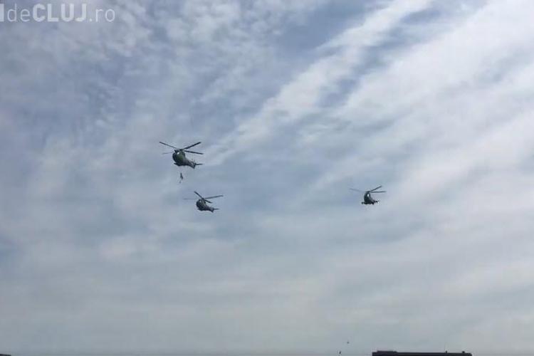 Cerul Clujului a oferit astăzi un spectacol de neuitat: tricolorul României, purtat de un elicopter, a fluturat mândru deasupra orașului într-un moment care a emoționat publicul adunat în centrul municipiului.