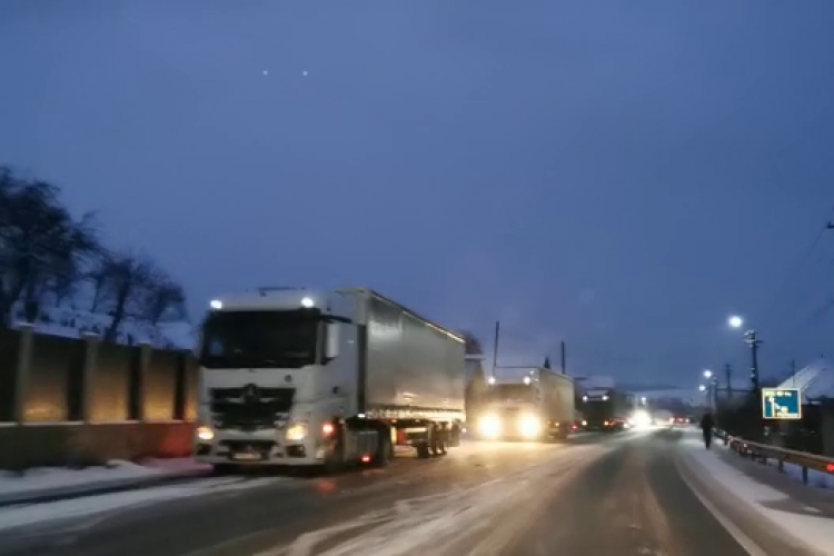TIR -urile au rămas blocate pe centura orașului Gherla, duminică seara, după ce drumul a fost acoperit cu gheață.