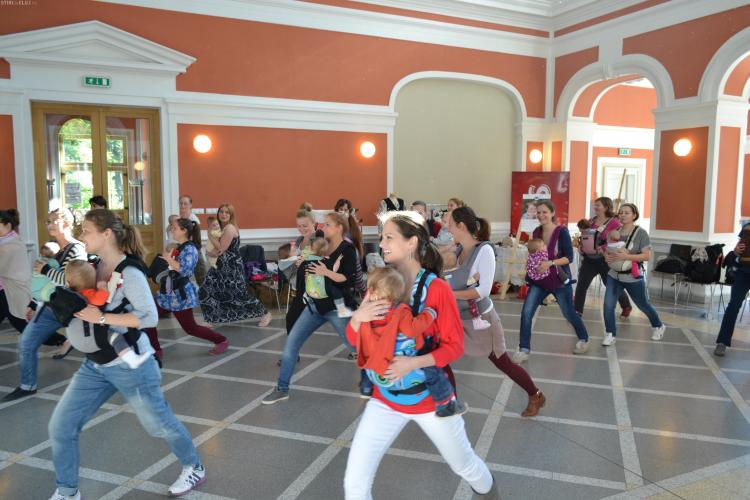 Mămicile din Cluj au dansat cu bebeluşii în sisteme de purtare, joi, la clădirea Casino.