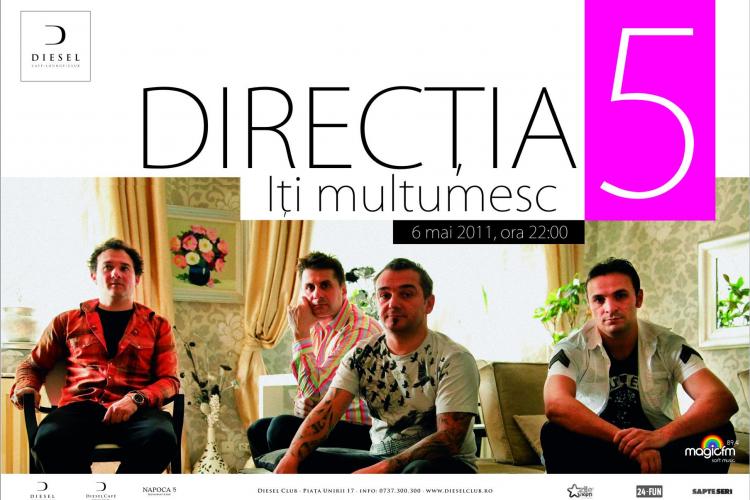 Directia 5 va concerta in Diesel Club vineri, 6 mai. Concertul este intitulat "Iti multumesc" si va cuprinde hiturile formatiei, dar si compozitiile noi.