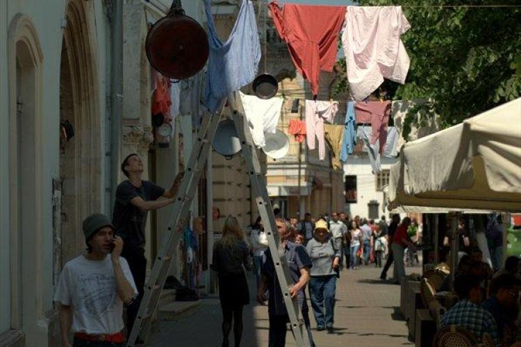 Camasi si alte rufe atarnate la uscat, oale si obiecte specifice satrelor de tigani au aparut pe trotuarul din fata Diesel Club. Unii clujeni au fost surprinsi, dar "tigania" este in numele artei.