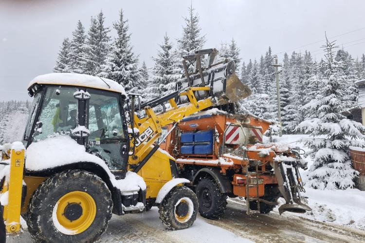 Intervenții pe drumurile județene clujene din zona de munte. Au fost folosite sute de tone de material antiderapant