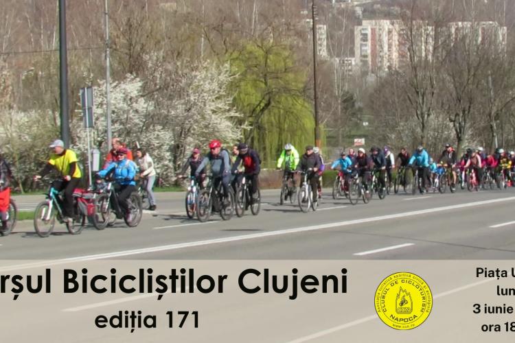 Clubul de Cicloturism Napoca (CCN), organizează în data de 3 iunie 2024 cea de-a 171 ediție lunară a Marșului Bicicliștilor Clujeni (MBC171), cu plecare la ora 18:00 din Piața Unirii.