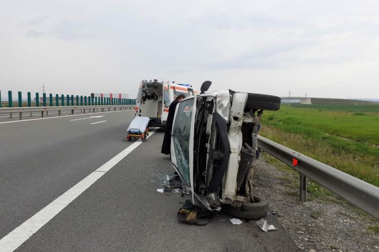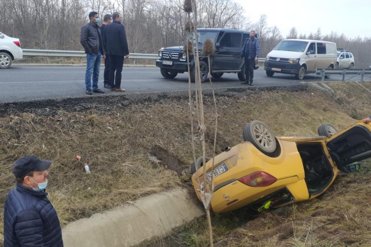 Un accident rutier s-a produs astăzi, în jurul orei 18 în Gilău, județul Cluj, pe drumul european. Un autoturism s-a răsturnat complet în urma unei coliziuni, ajungând cu roțile în sus pe marginea drumului