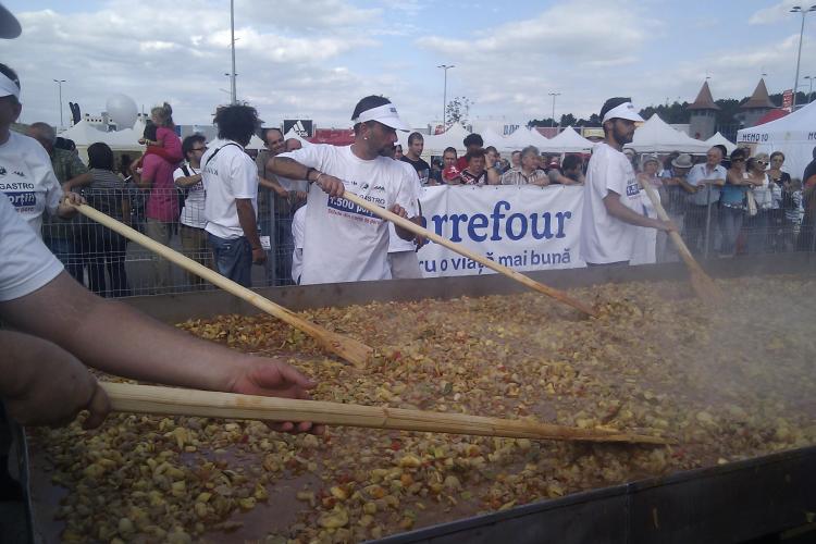 Carnatul cu diametru de un metru pregatit de bucatarii de la MEMO 10 a iesit perfect, spre deliciul zecilor de clujeni care au asteptat la Campionatul de Gatit in Aer Liber de la Polus pentru a gusta din el.