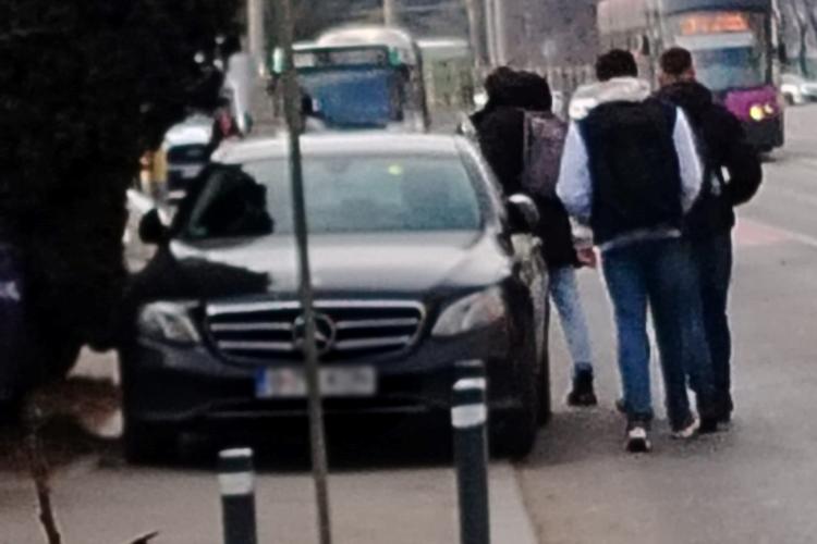 O filmare realizată de un clujean surprinde o limuzină Mercedes S Classe oprită ostentativ chiar în fața Liceului „Avram Iancu” din Cluj-Napoca, blocând complet o bandă de circulație în plină oră de vârf.
