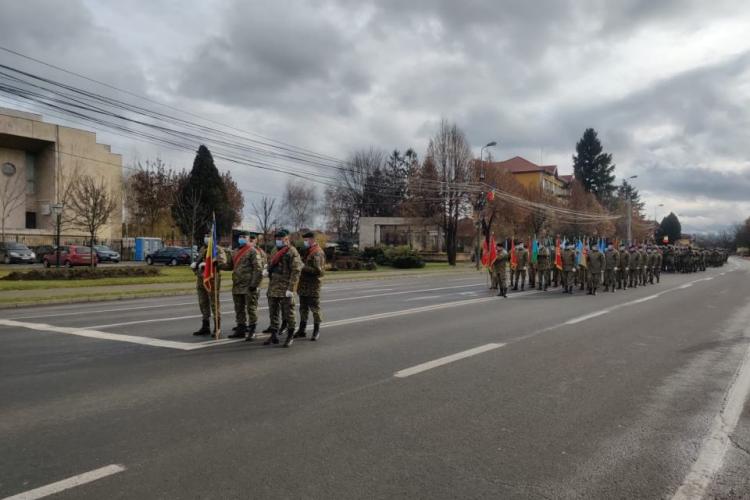Ceremonie militară superbă la Cluj de 1 Decembrie. Tricolor uriaș pe faţada Cercului Militar - FOTO