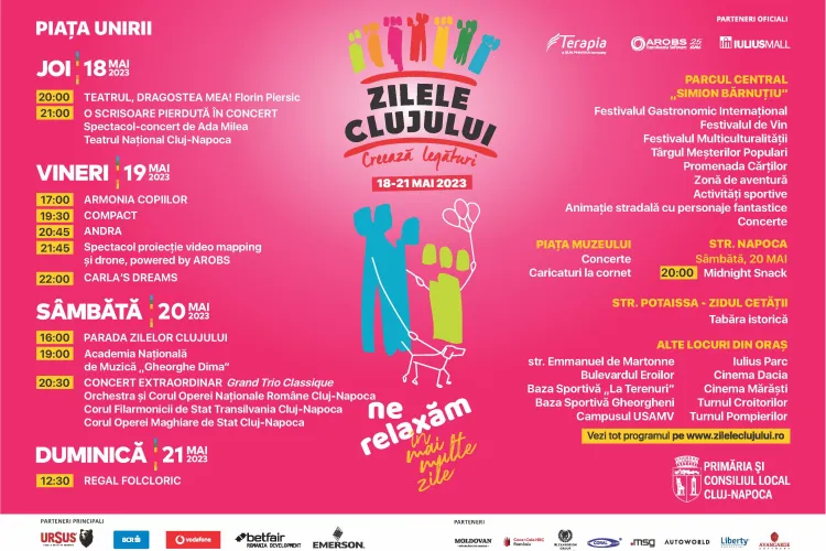 Timp de 4 zile, sărbătorim împreună orașul nostru cu peste 100 de activități în 40 de locuri din oraș. Zilele Clujului încep joi, 18 mai.