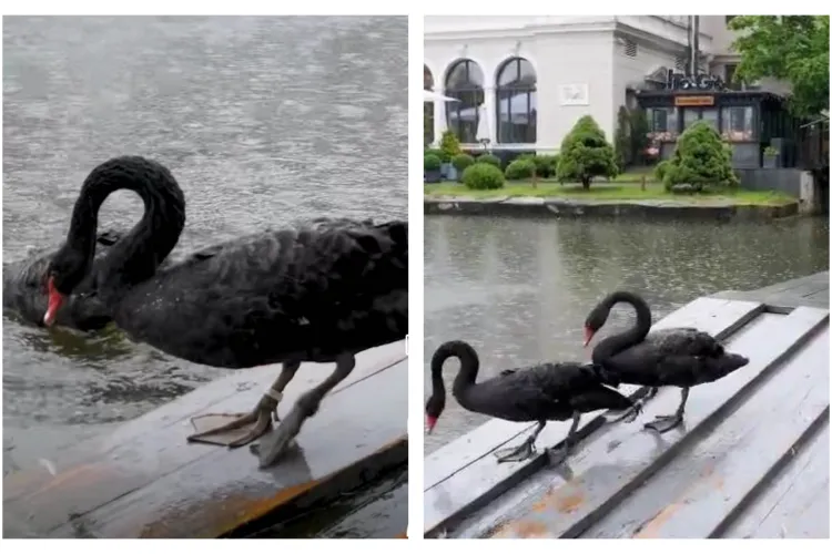O pereche de lebede negre încântă clujenii aflați în vizită în Parcul Central, la lacul Chios.