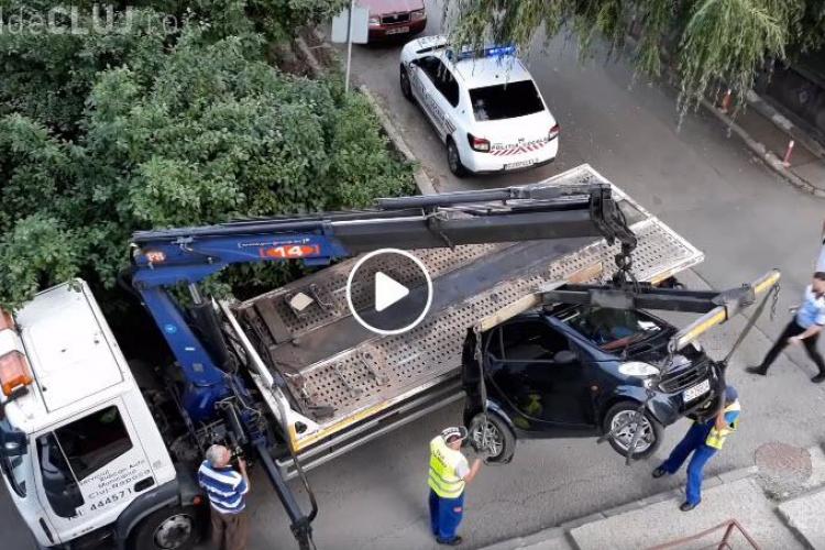 ”Băieții” de la ridicări auto din cadrul RADP Cluj au avut mari probleme cu un autoturism de mici dimensiuni.