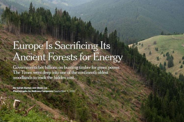 Publicația americană The New York Times a scris într-un reportaj publicat pe 7 septembrie că „Europa își sacrifică pădurile seculare pentru energie”, iar România este unul dintre exemplele unde jurnaliștii au documentat defrișări.