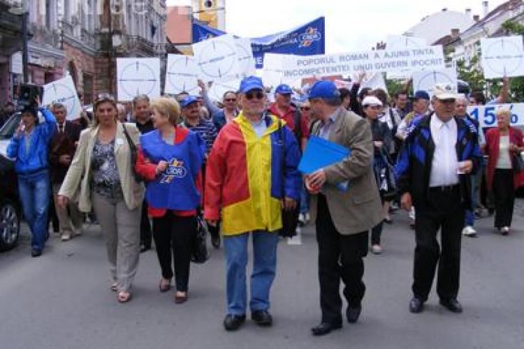 Membrii sindicatelor din Educatie si Sanatate picheteaza de la ora 15.. prefectura Cluj. Acestia cer demisia lui Traian Basescu si protesteaza fata de taierile salariale si problemele din sistem.