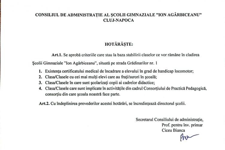 Opt clase cu copii din clasa zero de la Școala Ion Agârbiceanu din Cluj-Napoca se mută din lipsă de spațiu, dar copilul directoarei rămâne, pe baza unor reguli aprobate de Consiliul de Administrație al școlii, pe care directoarea îl conduce.