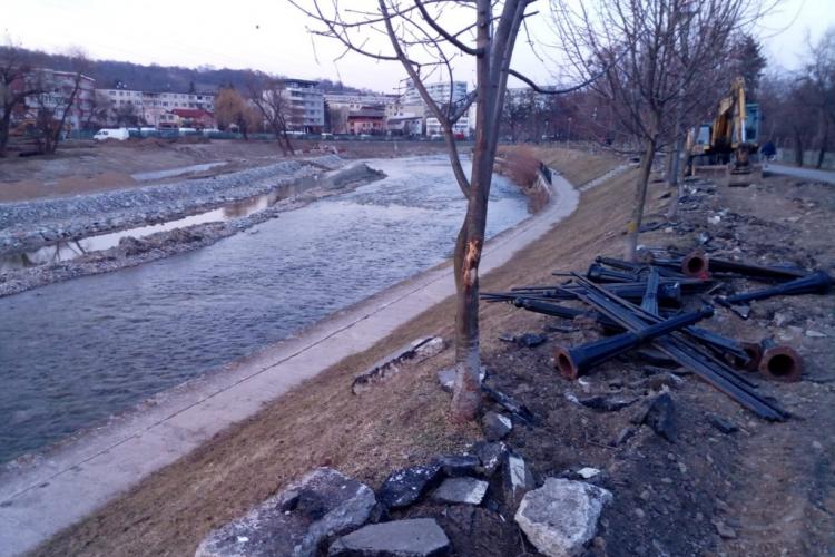 Lucrările de modernizare a malurilor Someșului au avansat și s-au mutat pe maul drept al râului. Muncitorii au început să dezmembreze și să adune partea metalică a promenadei de pe malul apei.