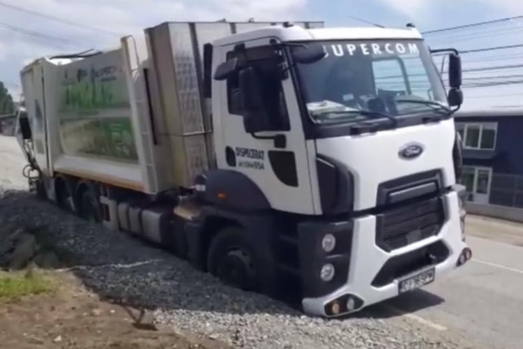 O mașină de gunoi a intrat cu roțile în asfalt la Dej, pe strada Bistritei, după ce acostamentul drumului a cedat.