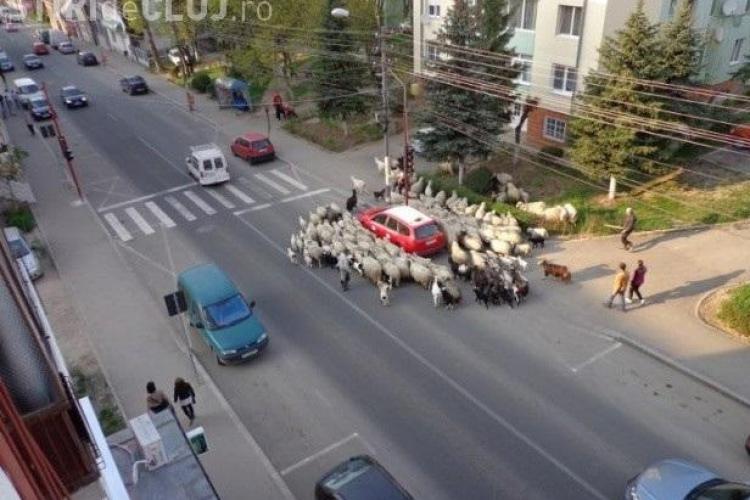 Un cioban a fost fotografiat în centrul Dejului în timp ce-și plimba turma de oi spre un câmp.