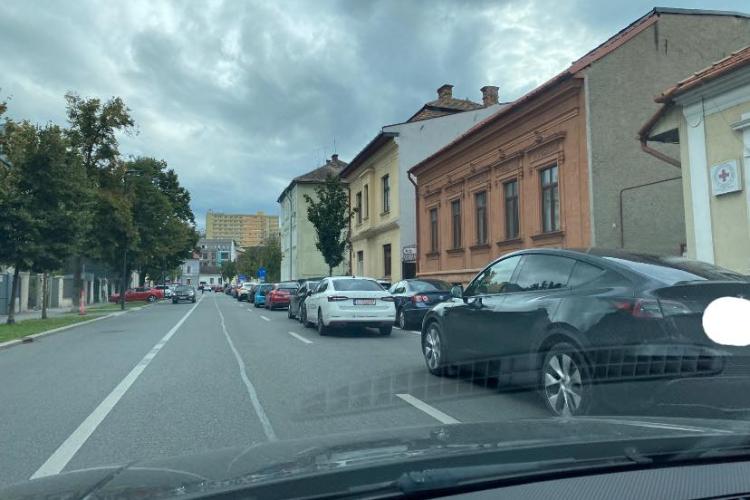 O bandă de circulație de pe o stradă din Cluj-Napoca s-a transformat într-un loc de parcare.
