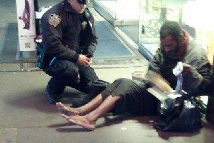 Un polițist din New York a fost fotografiat de către o turistă în timp ce oferea o pereche de cizme unui om fără adăpost din Times Square.