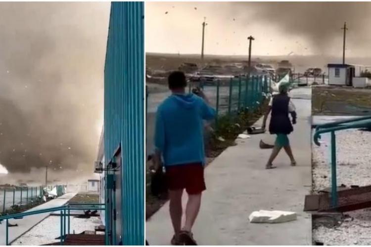 Imagini înspăimântătoare filmate la țărmul Mării Negre, în Crimeea. O tornadă puternică, formată din senin, a lovit joi, 18 august, cu putere o fermă de stridii din orașul Sakî. Vârtejul a măturat tot ce a întâlnit în cale, inclusiv zeci de mașini, dar și