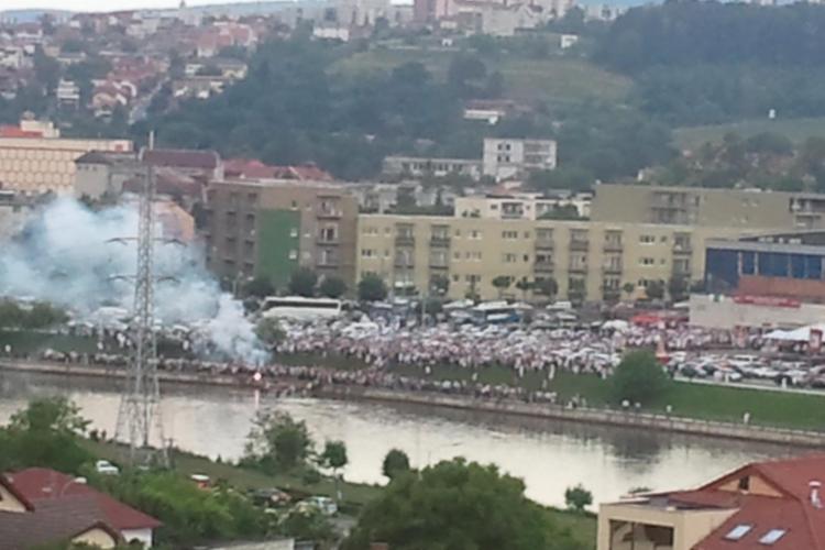 Campionii la baschet de la U Mobitelco au ridicat trofeul in aer in Piata Unirii in fata suporterilor. Chiar daca ploaia a scurtat sarbatoarea, jucatorii au apucat sa deschida o sampanie.