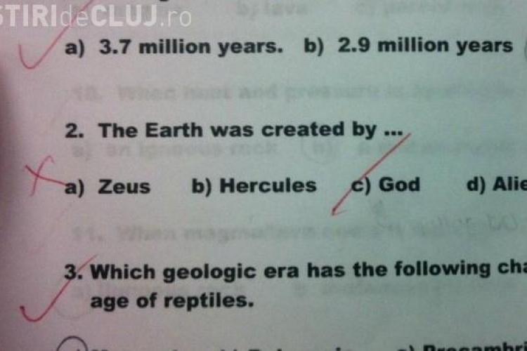 Fotografia unui test la geografie a stârnit mari controverse pe internet cu privire la una dintrre cele mai vechi întrebări din lume: ”Cine a creat Pământul?”.