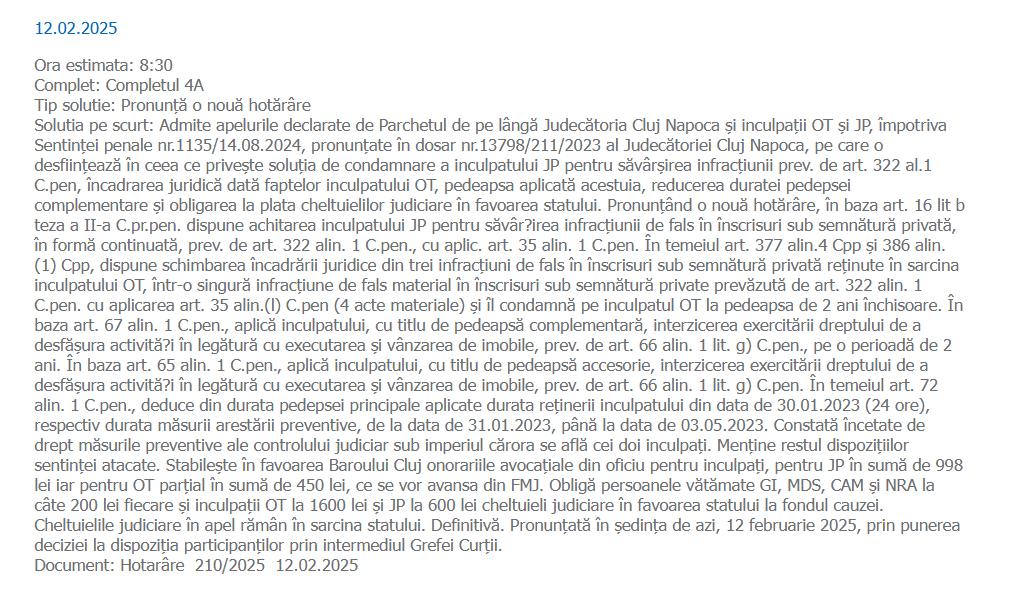 De asemenea, la data de 12 febriarie 2025, Curtea de Apel Cluj l-a condamnat definitiv pe țeparul imobiliar Traian Onuc la doi ani de închisoare cu executare într-un dosar în care era acuzat de săvârșirea infracțiunii de fals în înscrisuri sub semnătură privată în formă continuată.
