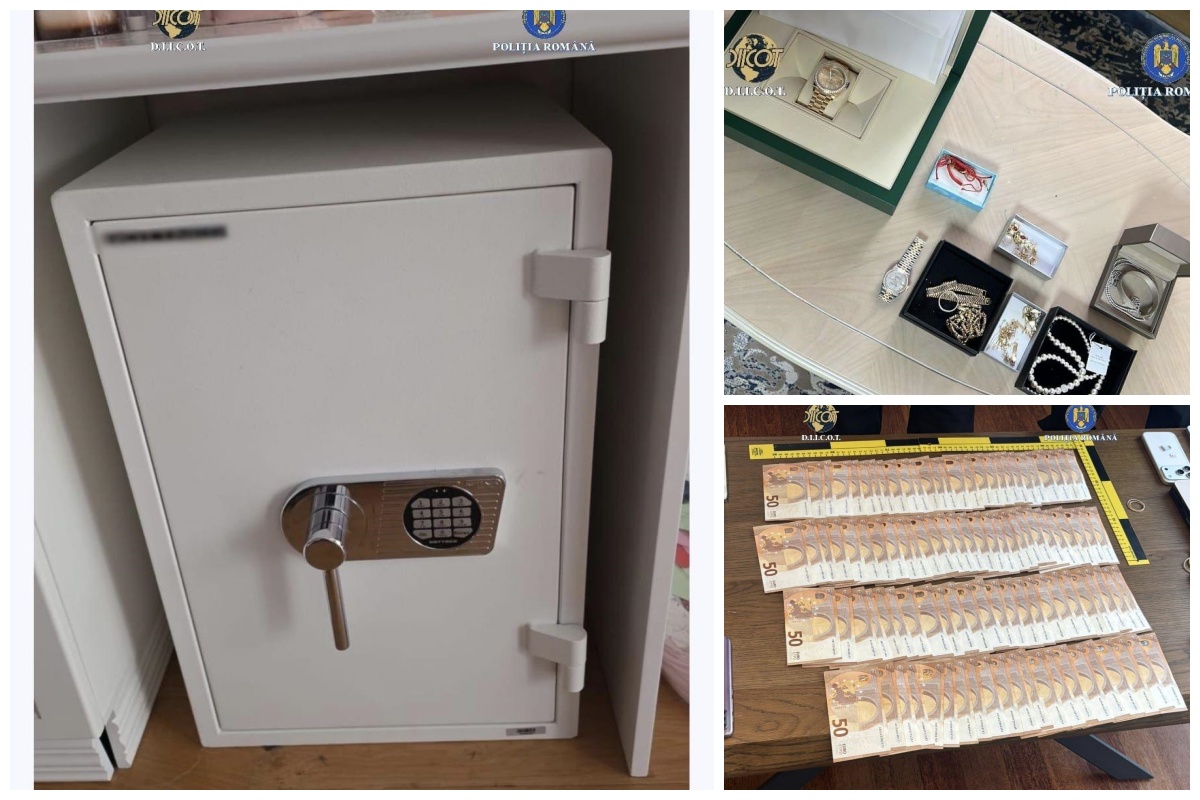 În urma perchezițiilor din 3 februarie 2026, polițiștii au ridicat documente, laptopuri, medii de stocare, bijuterii, patru ceasuri de lux, peste 23.000 de euro, precum și suma de 65.700 de euro formată din bancnote susceptibile a fi contrafăcute, alături de alte mijloace de probă.