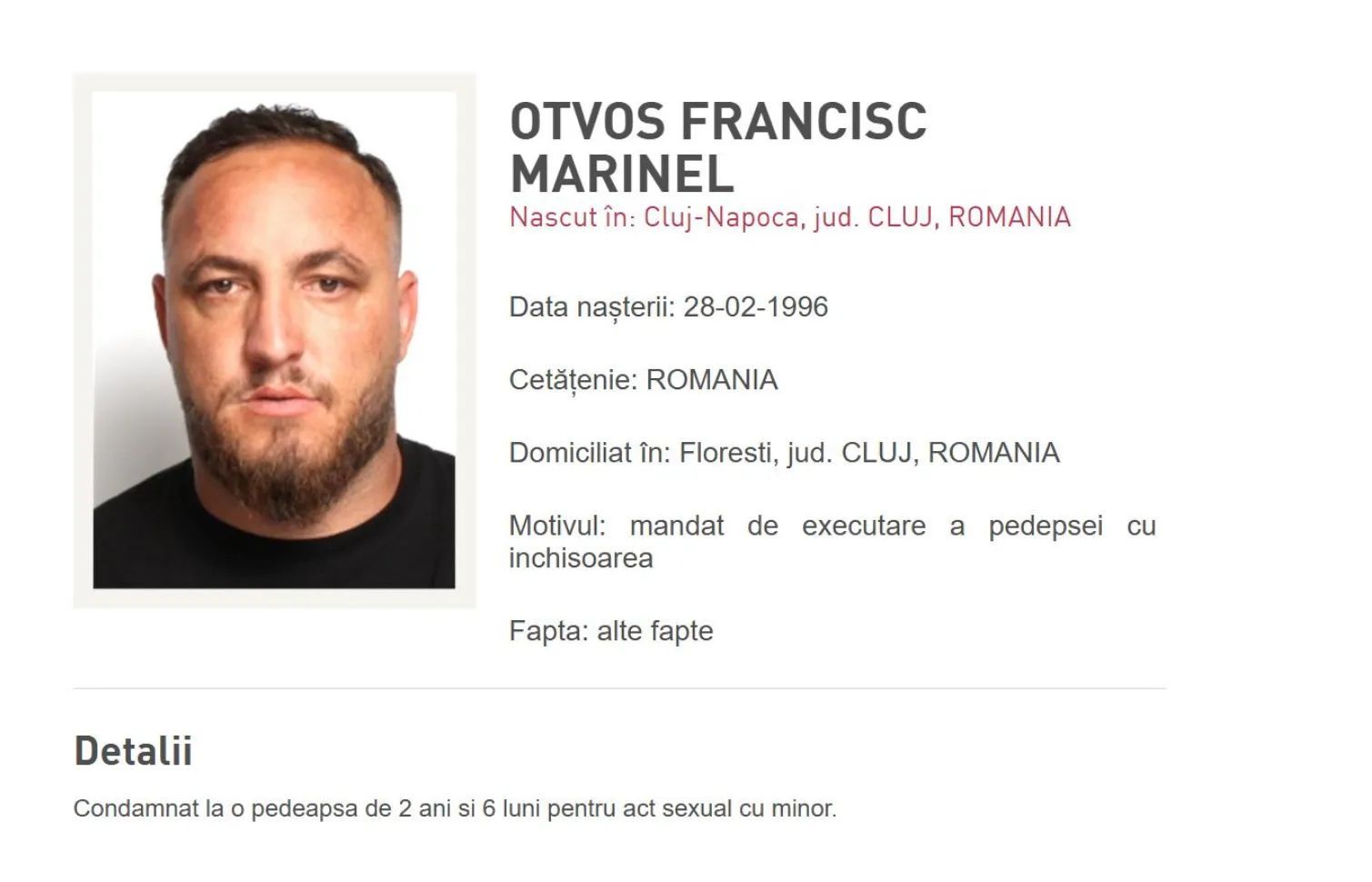 Otvós Francisc Marinel, născut pe 28 februarie 1996 în Cluj-Napoca și domiciliat în comuna Florești, județul Cluj, a fost condamnat la 2 ani și 6 luni de închisoare pentru act sexual cu minor. Pe numele său fusese emis, în data de 29 ianuarie, un mandat de executare a pedepsei cu închisoarea de către Judecătoria Cluj-Napoca.