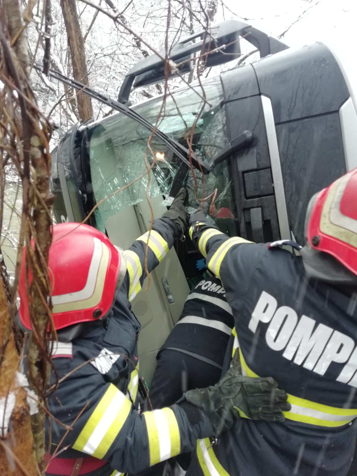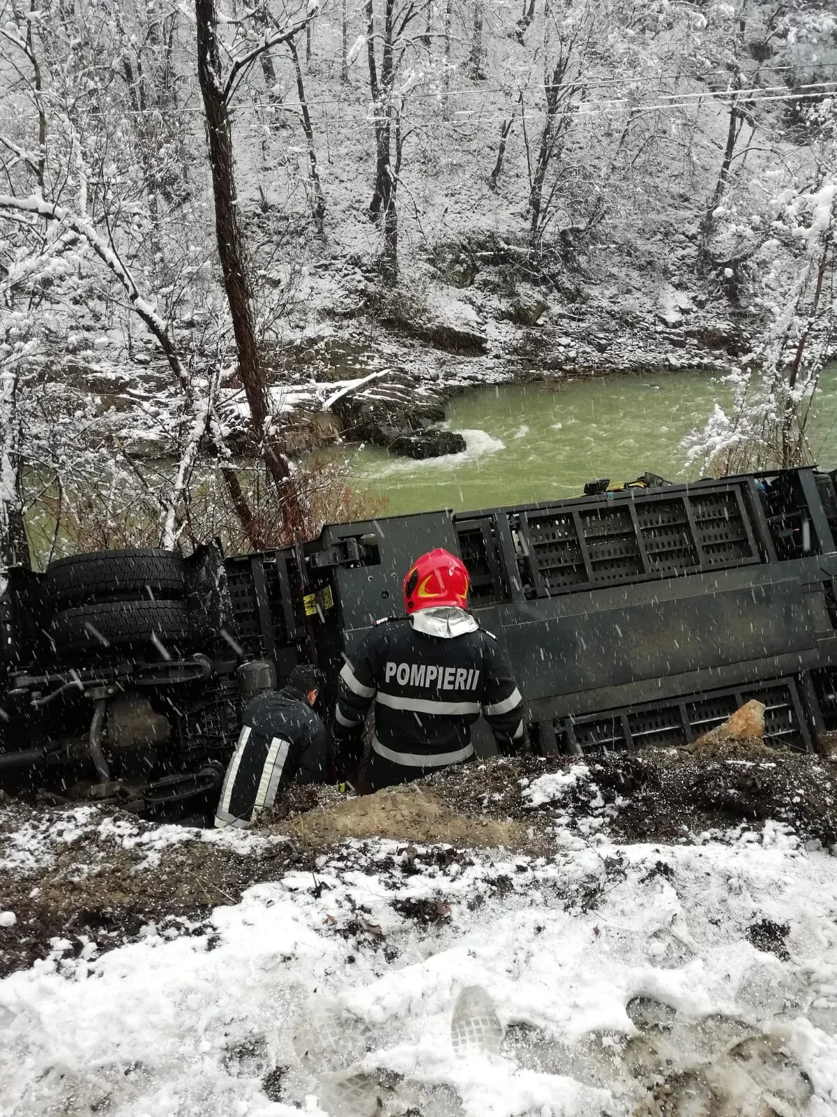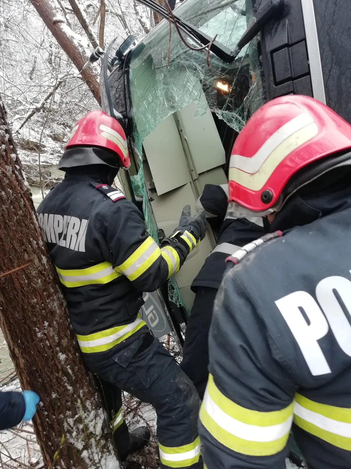 Pompierii lucrează șa stabilizarea autotrenului si descarcerarea victimei. Victima a fost descarcerată si predata echipajului medical, conștientă, suferind un traumatism toracic.