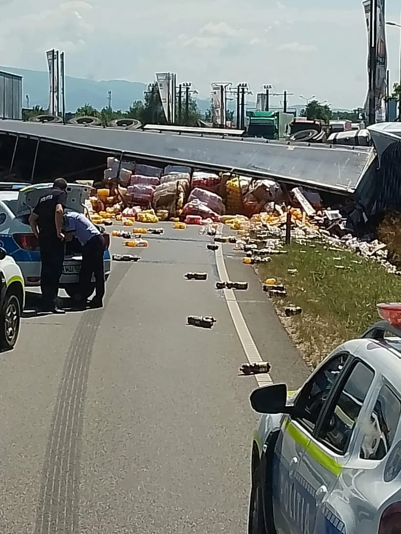 Un TIR încărcat cu bax -uri cu suc s-a răsturnat pe drum. Un alt autoturism implicat în accident a ajuns în șanț, unde s-a răsturnat.