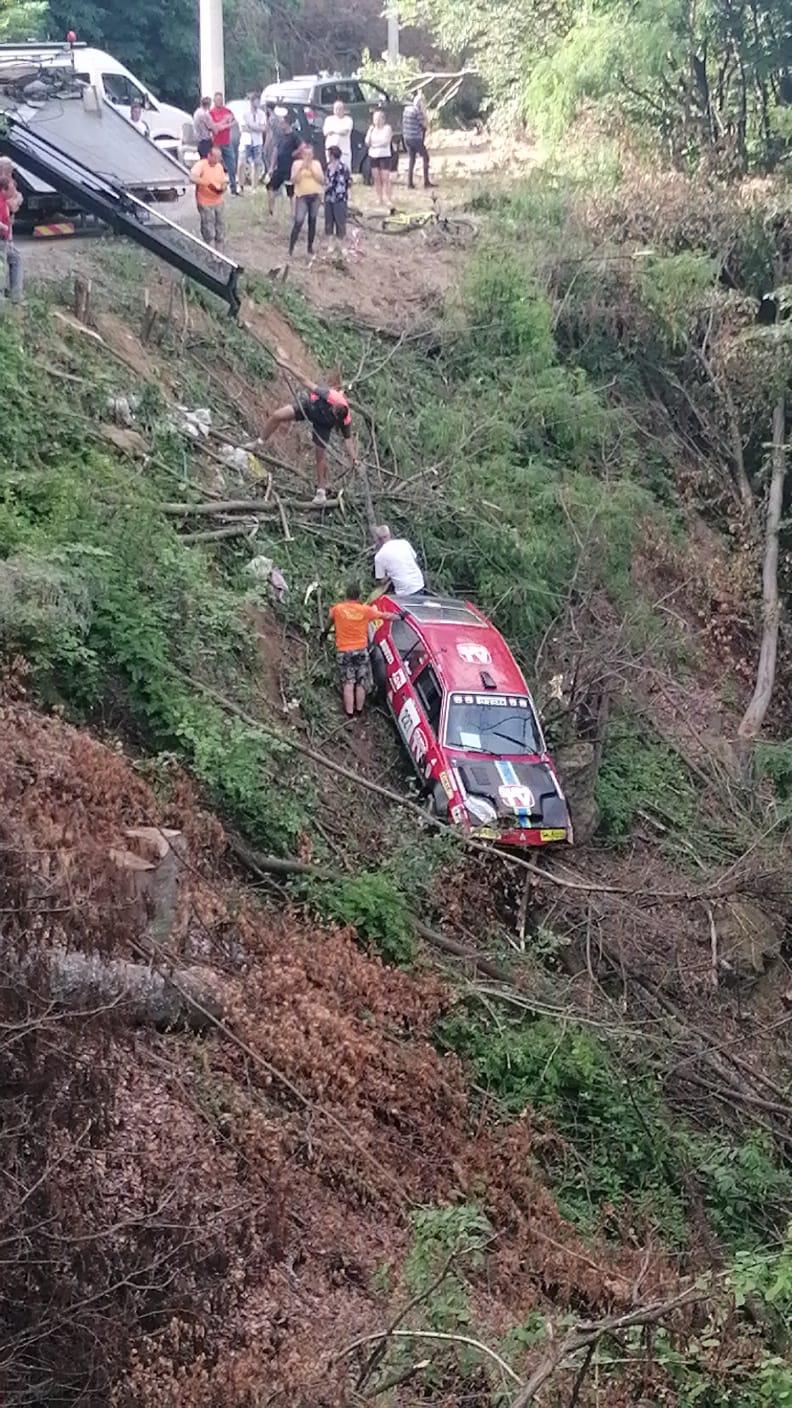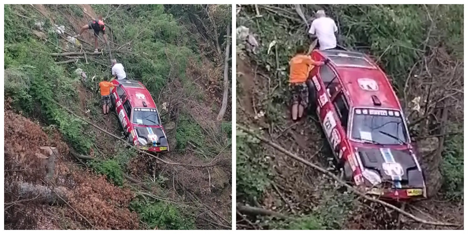 Un echipaj de la Raliul Maramureșului a căzut într-o râpă uriașă, în timpul cursei de sâmbătă. Mașina a ieșit de pe drum și norocul a fost că s-a oprit în lemnele căzute în urma tăierilor.
