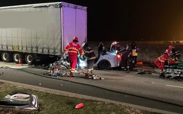 Accident teribil pe o șosea din Sibiu. Doi tineri și-au pierdut viața după ce o mașină a intrat într-un TIR oprit pe marginea drumului
