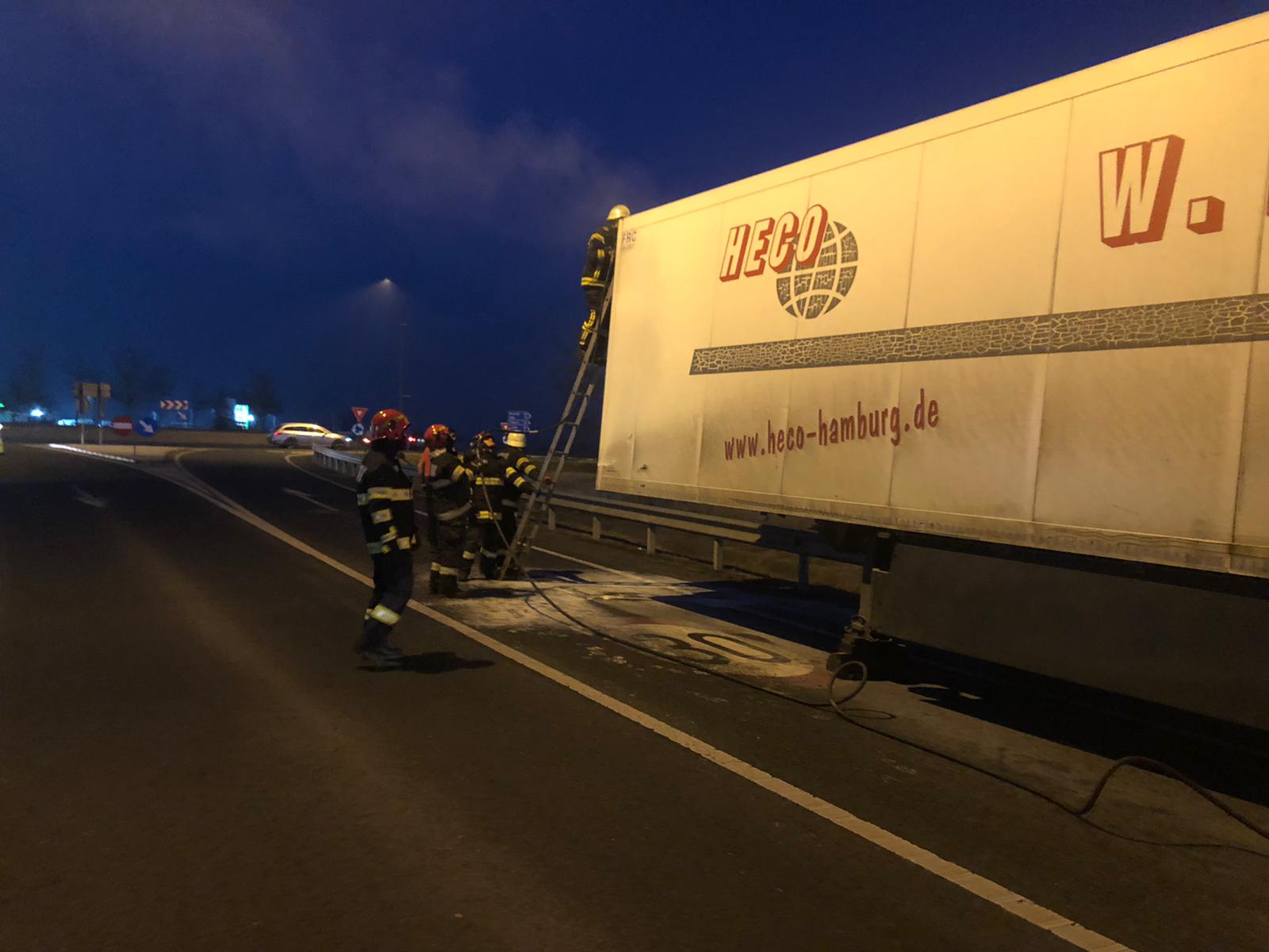 Un incendiu la o remorcă frigorifică s-a produs pe DN 69, în sensul giratoriu din Aradul Nou, lângă Gazprom.