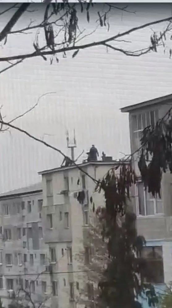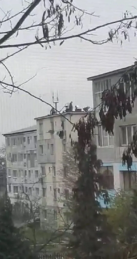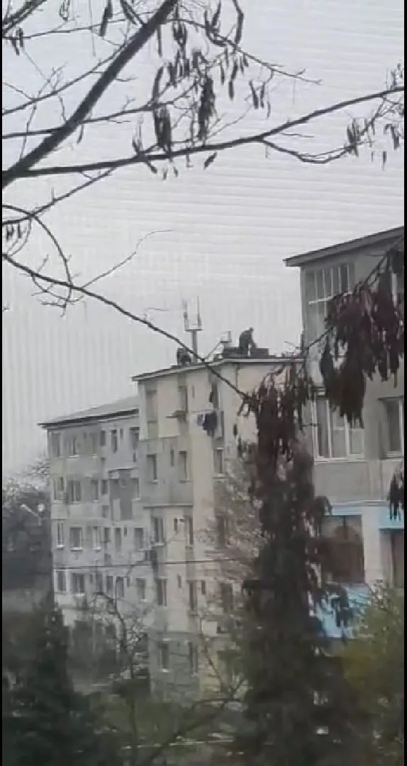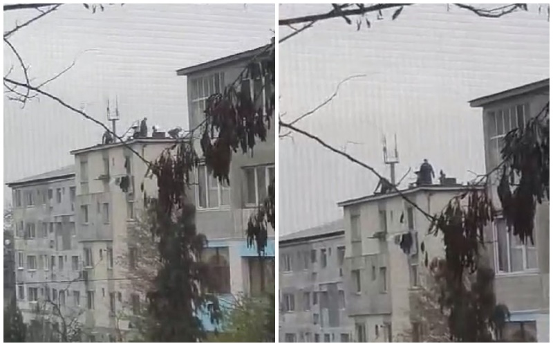 Șase bărbați și un băiețel de aproximativ 5-6 ani au luat parte la sacrificarea porcului de Crăciun la… înălțime.