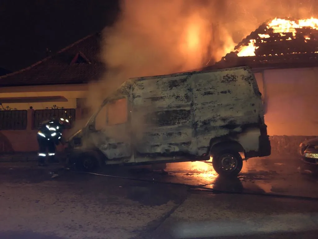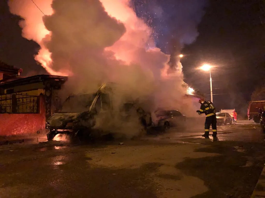 Un microbuz a fost incendiat în cursul nopții la Mediaș, iar de acolo focul s-a extins la acoperișul unui depozit de fructe de pe strada Aurel Vlaicu.