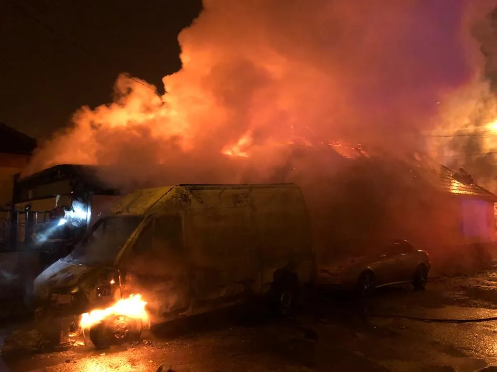 Atentat cu tentă criminală la Mediaș! A dat foc unui microbuz și focul a cuprins și un depozit de fructe - FOTO