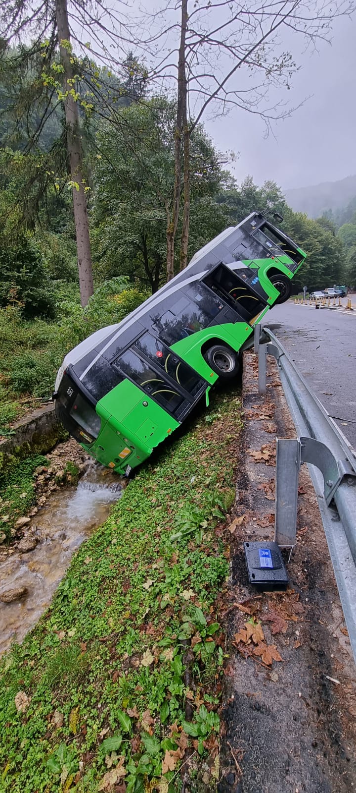 Incidentul s-a produs în Brașov. ”În urma unor intervenții tehnice efectuate la nivelul unui mijloc de transport public de persoane, ce se afla staționat pe strada Podul Crețului din municipiul Brașov (zona Pietrele lui Solomon), vehiculul a părăsit partea carosabilă, răsturnându-se în canalul de colectare al apei pluviale.