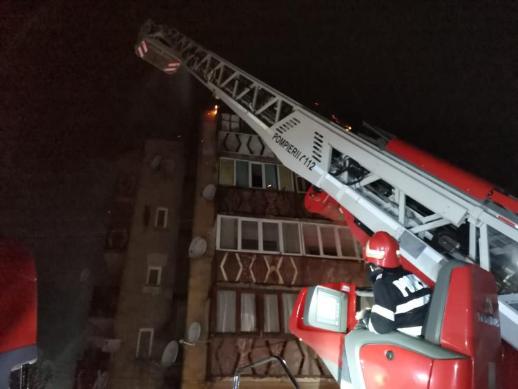 Incendiul s-a manifestat cu violență, generalizat, pe o suprafață de aproximativ 400 mp la nivelul acoperișului blocului.
